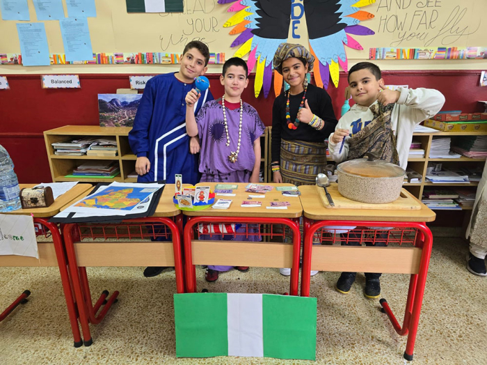The students of grade 5 A and B, led by their teacher Ms Rosie Melhem, organized an event involving the PYP theme they are covering. The students were divided into different groups with stations representing cultures from around the world. The students hosted their parents, and each group shared about their choice of country. The students explained, sang, danced, exhibited paraphernalia, and were generous in their food offerings.